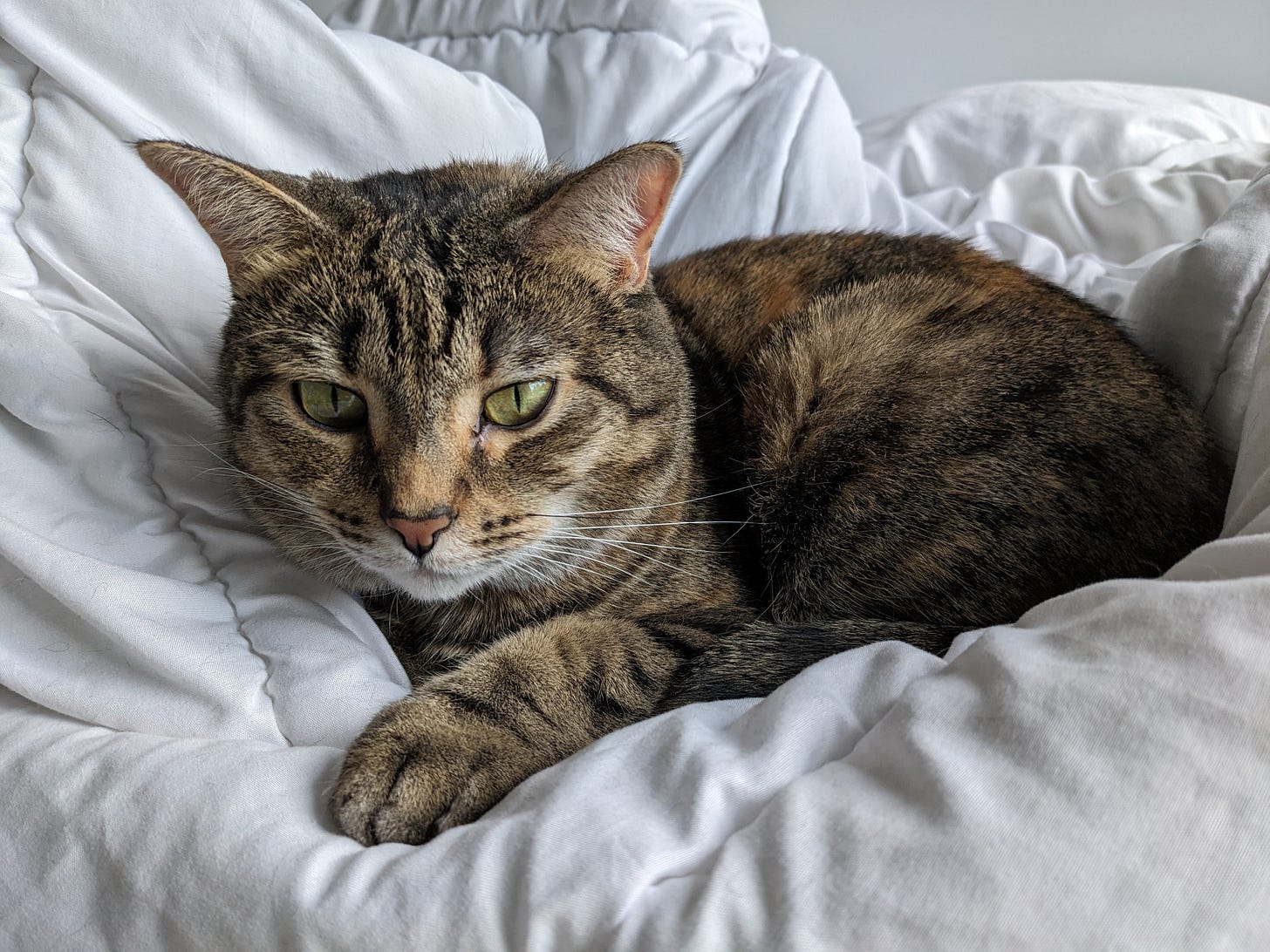 Today is KitKat’s fourth birthday (it’s also the anniversary of her adoption date, since no one knows the actual day of her birth.) She’s spending the day as she usually does: sleeping, eating, and meowing all morning.