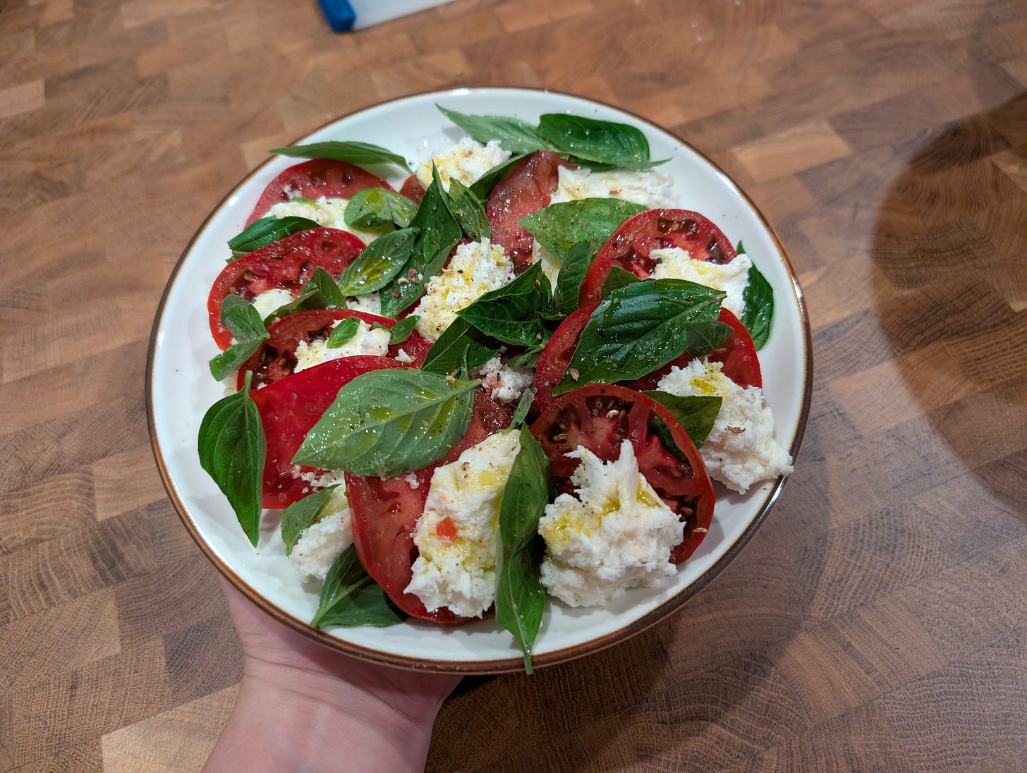 I also got a few tennis ball-sized heirloom tomatoes, which weren’t quite in their prime yet, but good enough for a caprese salad.