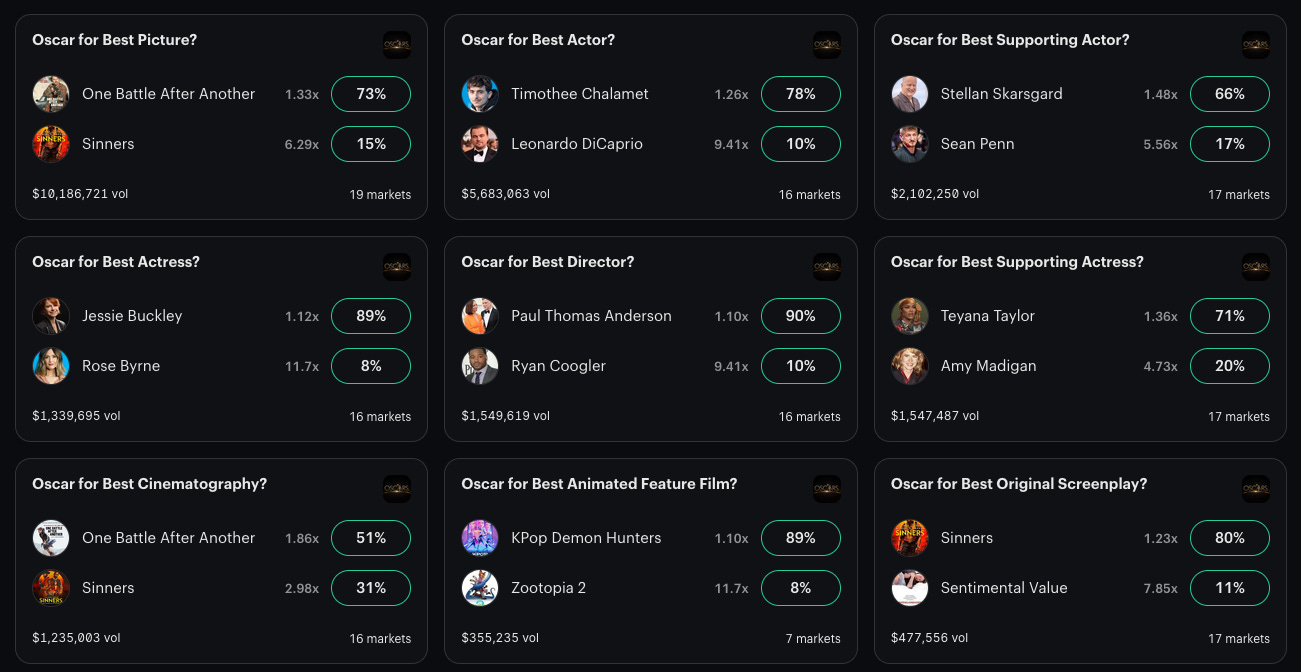 I think what’s happening here is a lot of casual betting. Second highest odds is Sinners. I think that might be a reaction to that film setting the record for nominations. That is a gigantic trap. And then third place is Hamnet at 9%, which is 9% too high.