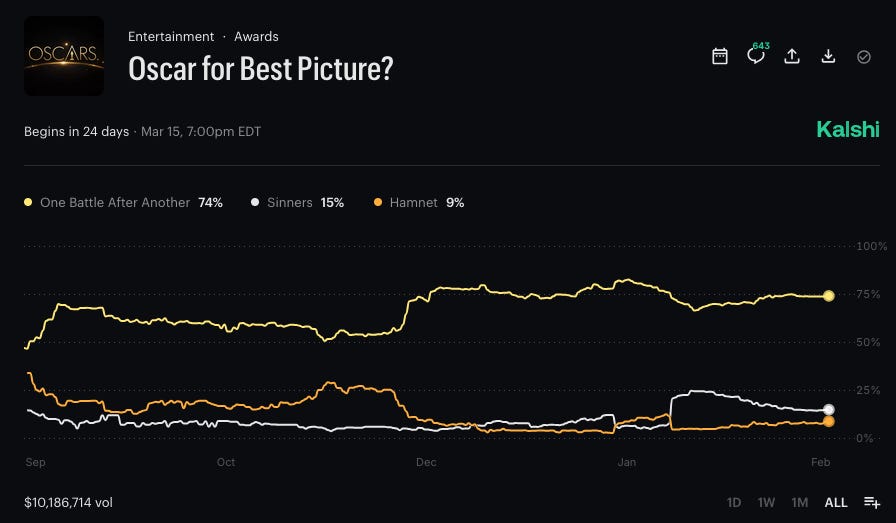 I thought One Battle After Another was a lock for Best Picture. Somehow the odds have gone down. It was 82% on Kalshi when we talked a month ago. It is now 74%. That is the only bet where I doubled down so far. I put in the equivalent of 15% of my original portfolio.