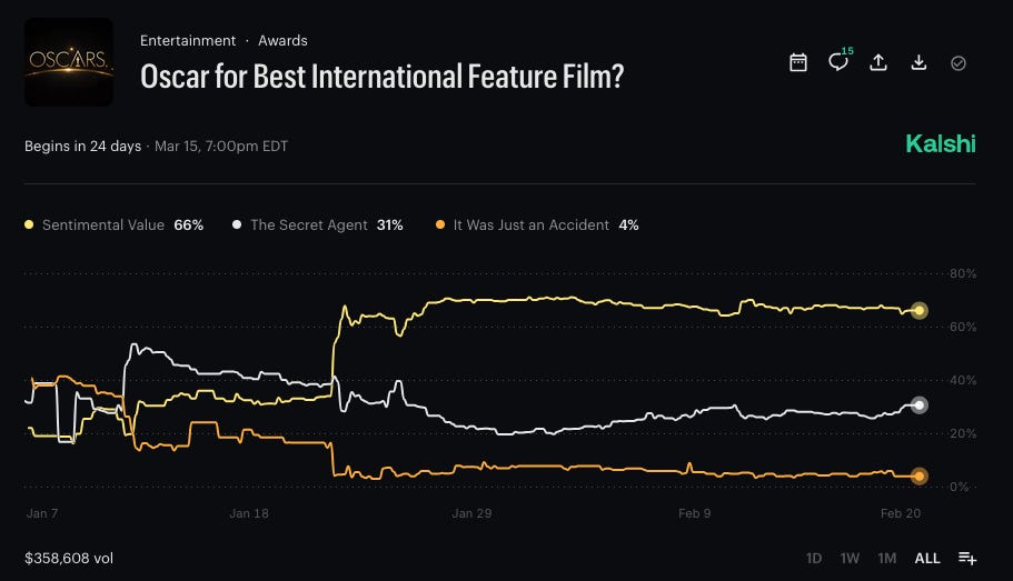 I’m not sweating it too much because the two picks that I really liked were It Was Just an Accident for International Feature, which was trading around 40%, and then F1 for Sound, which was also trading around there. And that one is like 80-something now. That should more than pay for the International Feature bust. In my head, they cancel out.