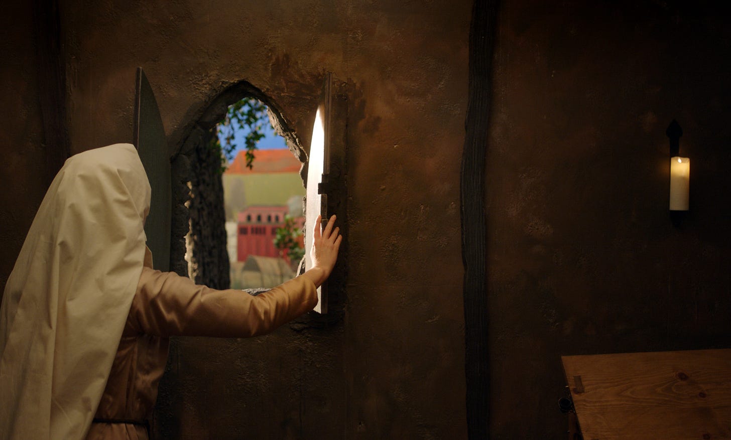 When we first meet Julian (Tessa Strain), she’s being sealed into a cell. A bishop administers rites while a laborer builds the wall that will shut her in for the rest of her life. But this isn’t The Cask of Amontillado—Julian has chosen to become an anchoress, someone who sequesters herself from wider society to devote her life towards God. She stands with confidence, her piercing gaze looking out as the last stone is placed.