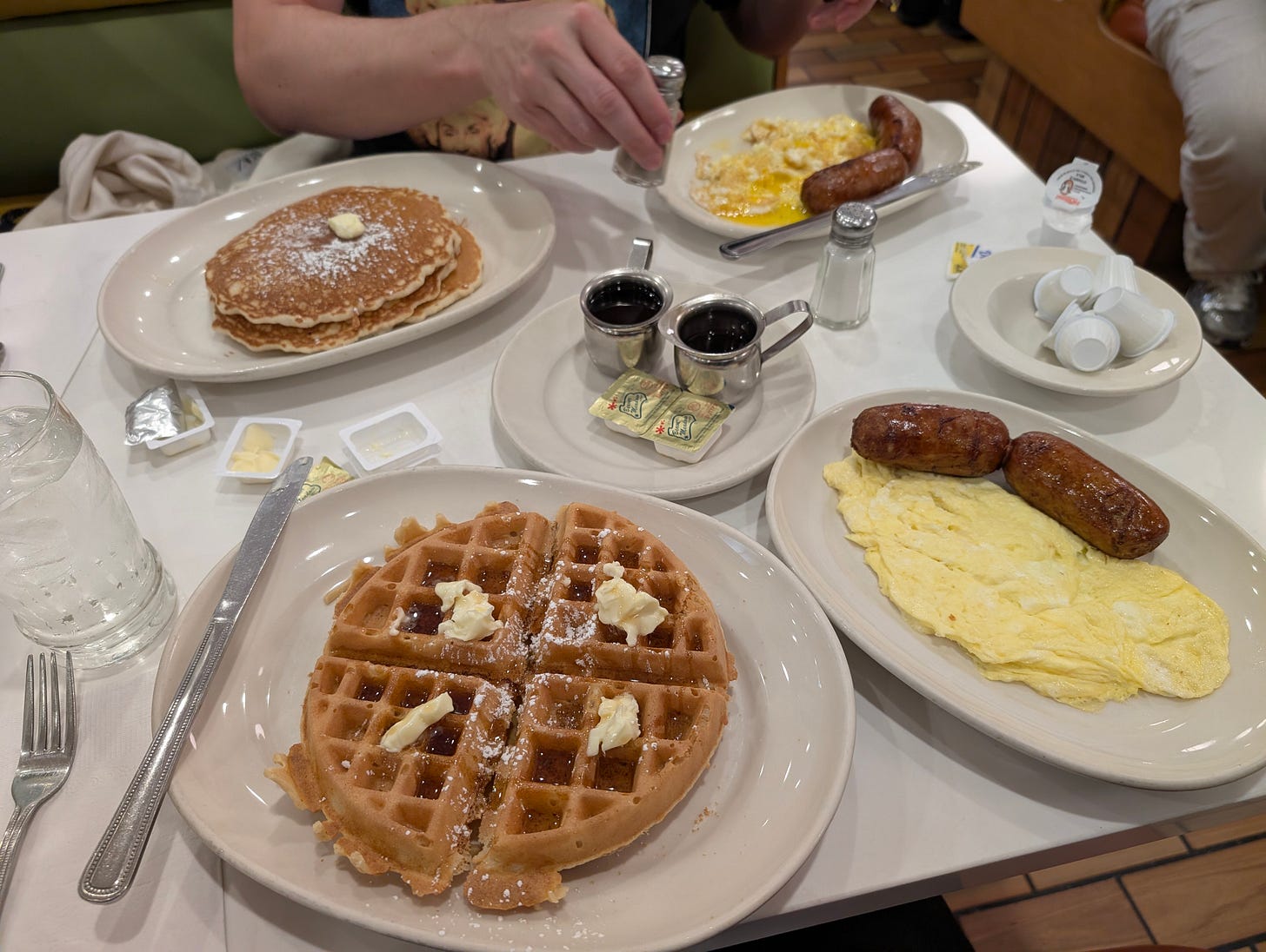 Inspired by all those diner scenes, for lunch I head to Flame Diner with Keith where we debrief the movie. He was assigned to quickly turn around a review, and lo and beyond that evening it’s up on the publication’s website. (Would that I were so rapid.) I ordered the “lumberjack waffle breakfast” which hit the spot, but this would only satiate a pretty skinny lumberjack: two belgian waffles, a pair of breakfast sausages, and scrambled eggs. Usually you get bacon and hash browns and much larger portions of all.