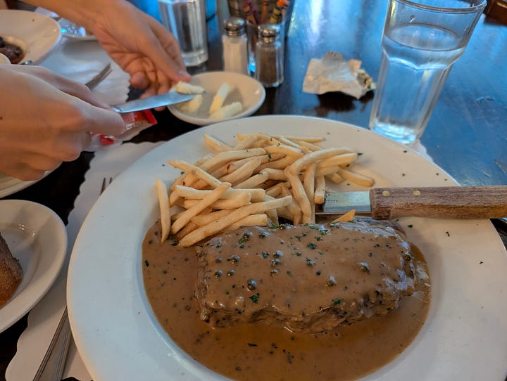 Every year, NYFF hosts a splashy Opening Night afterparty at Tavern on the Green affectionately known as Movie Prom. As we were not invited, Kenji and I made alternate plans and in the evening we headed to Times Square for dinner and a show. We ate at Cafe Un Deux Trois, perhaps named after the excellent Billy Wilder picture One, Two, Three. (There’s a big poster on the wall.) I got steak frîtes which are always satisfying.