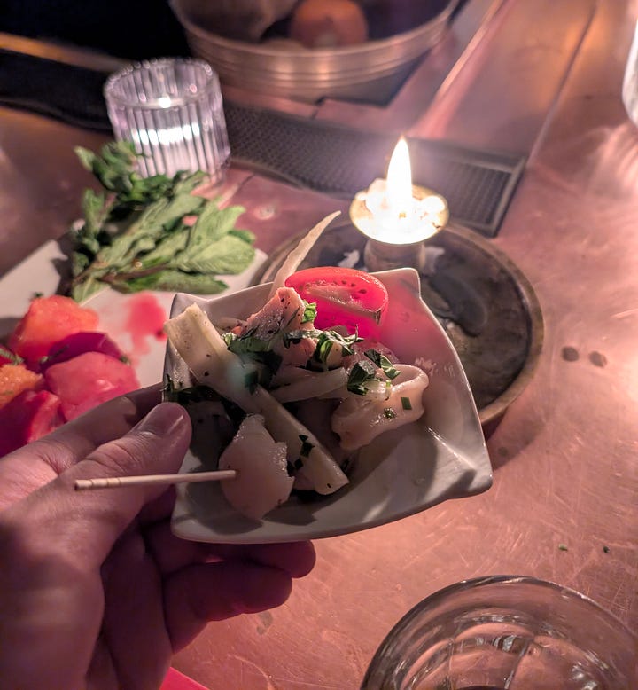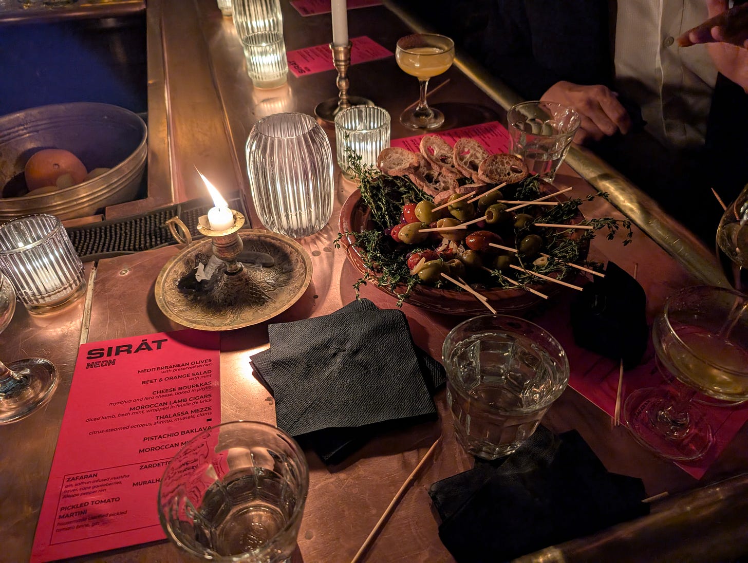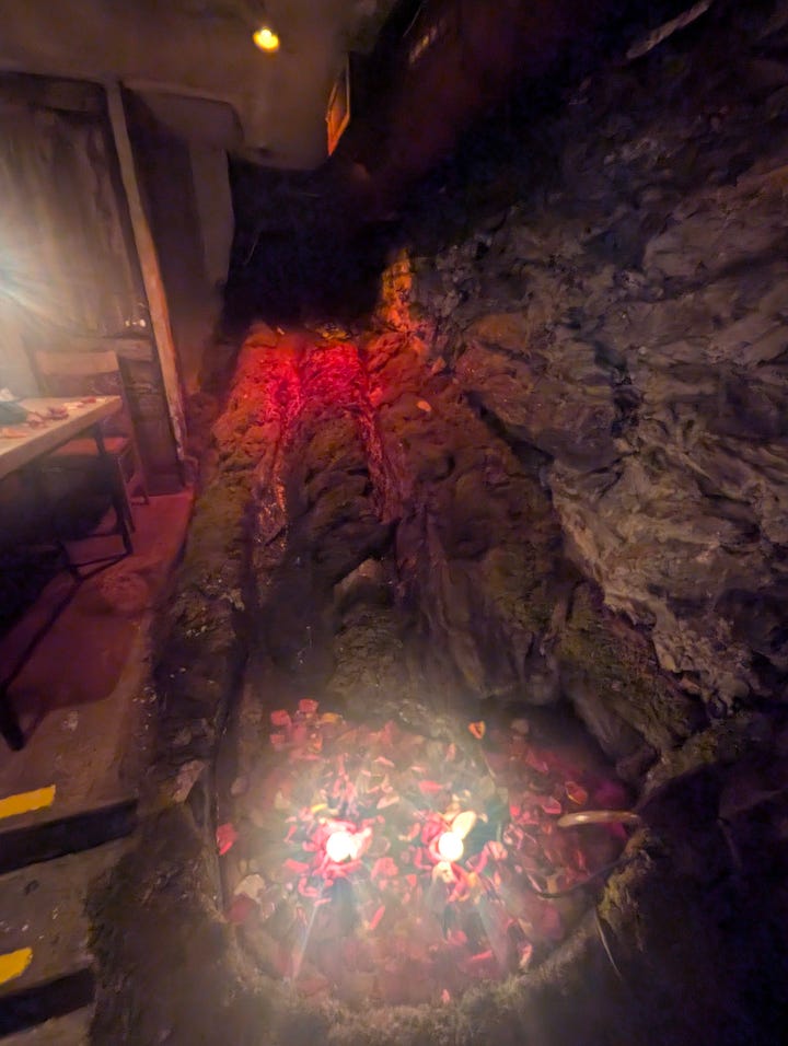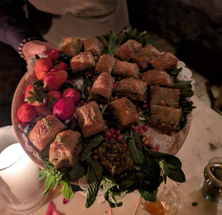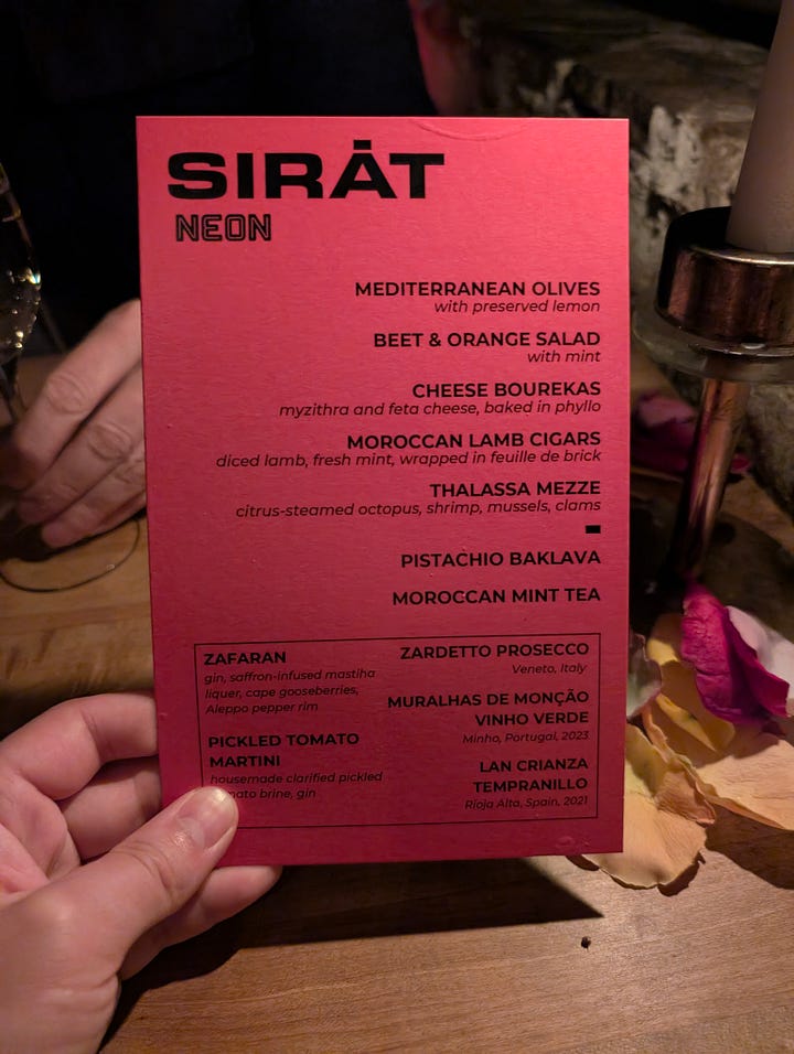 The Moroccan decor and transportive atmosphere made Shalel the perfect location to celebrate the NYFF premiere of Sirāt, a pulse-pounding desert rave thriller. It was my first time at this Middle Eastern restaurant, so I wasn’t quite prepared for how different the vibe was from the sterility of 70th Street: the underground brick-lined space felt like an old world inn. There’s even a small waterfall in the back, with rose petals strewn atop the little pond at the bottom. Kangding Ray’s techno score was playing over the speakers, adding a further level of immersion.