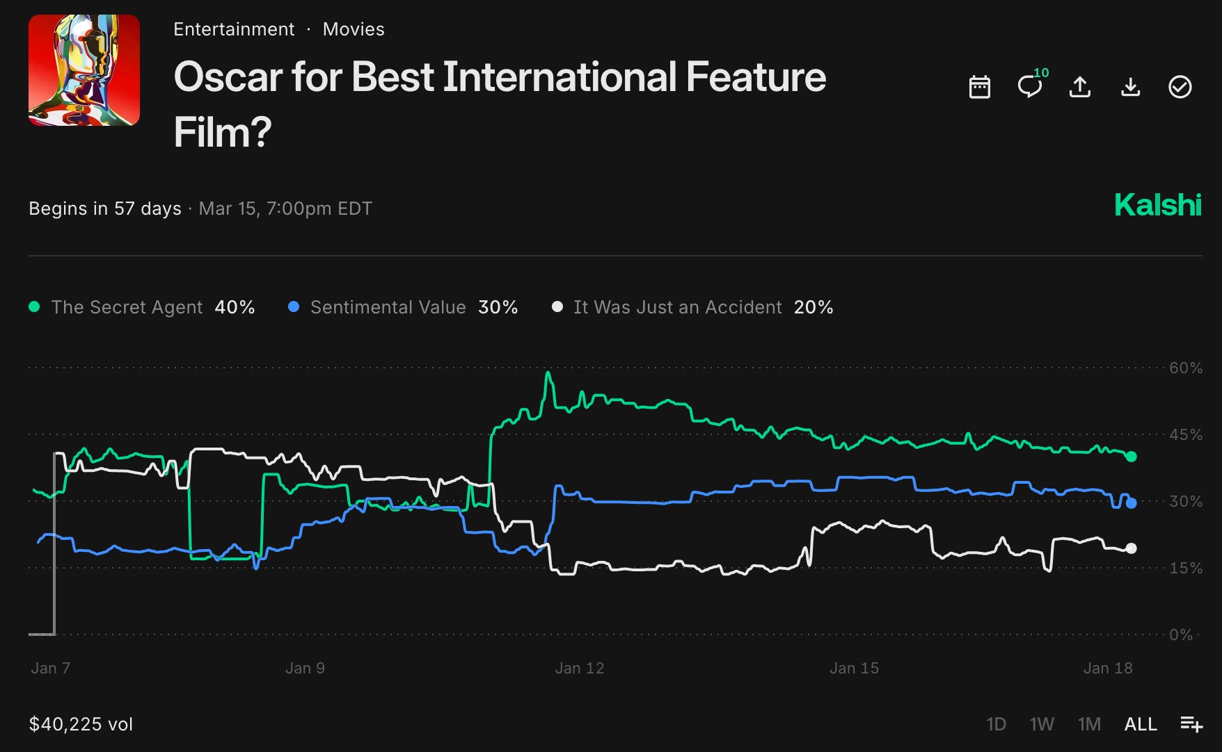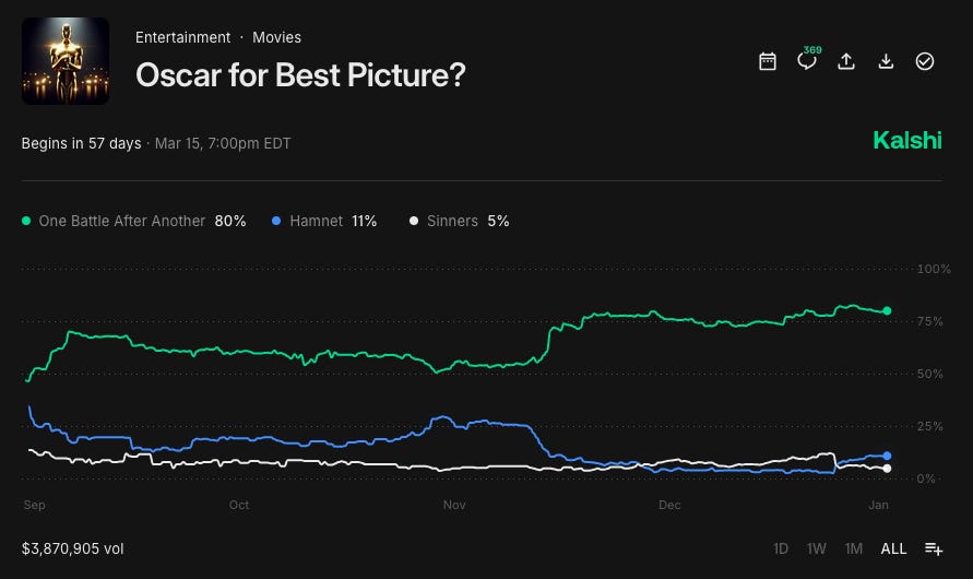 The Secret Agent won last night at the Globes, so it’s the favorite now. But I’m very confident in It Was Just an Accident. It’s at 14% on Kalshi right now, which I think is criminally low for a film of that caliber.