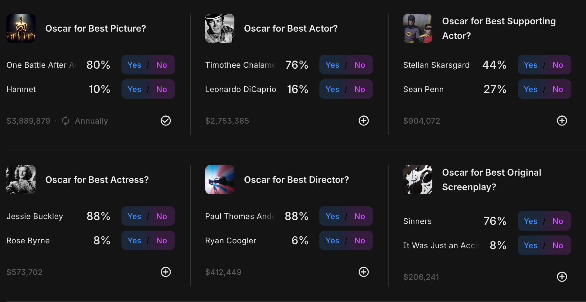 That was something I was looking at, the total market volume. Best Picture has almost $4 million in play but International Feature only has around $30,000. If I put $1,000 into that category, it’s going to move the odds dramatically.