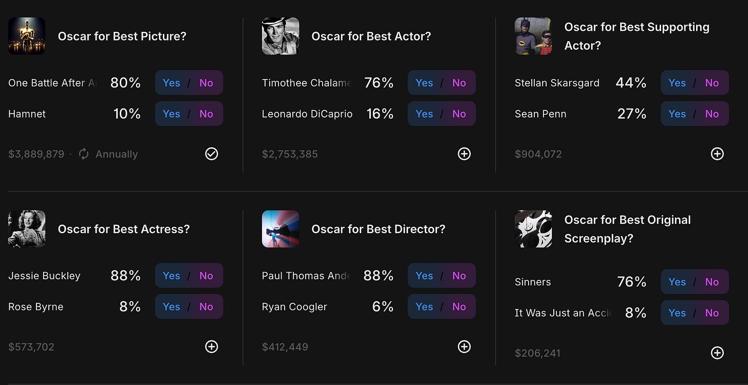 Jason is a management consultant who has never lost money in his seven years of betting on the Oscars. (His last name is withheld for privacy reasons.) Originally he went through a bookie, but last year he switched to placing his bets on Kalshi. We had a very nerdy discussion about how prediction markets differ from traditional sportsbooks, how optimal betting strategies are more complicated than just picking winners, and his narrative for this year’s race.